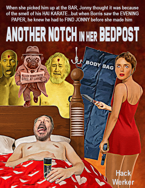 Meanwhile, across town inside Jonny’s favorite watering hole—a joint where the barstools leaned like retired prizefighters and the jukebox coughed up sad saxophones—fate was already rolling snake eyes. An angelic devil in high heels sauntered in, all curves, confidence, and the kind of smile priests warn you about. Brigid O’Shaughnessy. Jonny took one look and felt his heart hiccup; she was the most luscious dame he’d clapped eyes on… at least since yesterday afternoon. As he nursed his virgin piña colada and rehearsed a dozen suave greetings he’d never say out loud, she marched straight up to him and purred, “My name’s Brigid. Let’s go back to my place.” Jonny thanked the heavens for his generous slathering of Hai Karate aftershave—liquid courage for the romantically doomed—and in less time than it takes a bartender to blink, he was following her out into the night, utterly unaware he was strolling hand-in-hand with the headline Boris was racing to outrun.