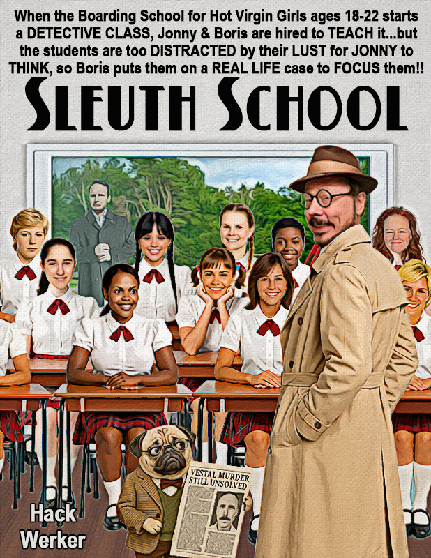 The Van Nuys Boarding School for Hot Virgin Girls, ages 18 to 22 had been desperate to add a little grit to their spotless campus. So when they started a detective course, they hired the only duo in the Valley whose reputations were bigger than their caseloads: Jonny M. and his pug partner Boris. The moment Jonny walked into the lecture hall in his trench coat and henna-dyed beard, every student sat up straighter. Gidget the All-American surfer, Judi the wholesome blonde triple-threat, Wednesday the gloomy goth who never blinked… they all watched Jonny with a starry-eyed intensity that could melt the varnish off a file cabinet. It wasn’t detective work they were interested in—it was Jonny. Three times their age and dumb as a post, but with a bulge in his wrinkled slacks that was all they could think about.