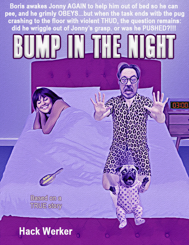 This novel was based on a true story when Hack was sleeping on Jonny and Boris’ couch, only to be awakened from a resounding crash that came from their bedroom. He went to check it out to find them arguing about whether Boris had fallen to the floor after he jumped out of Jonny’s hands when he was trying to help him down so he could pee, or whether Jonny has pushed him. The incident was forgotten the next day, save for this manuscript that Hack had cranked out after the pair went back to sleep.
