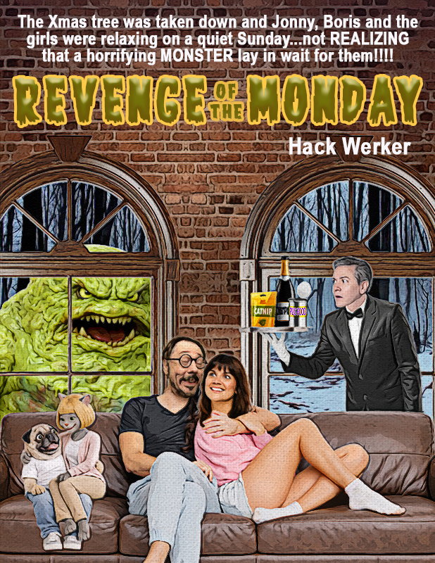Sunday bled out slow and sour at Casa de Jonny, like cheap liquor seeping into an expensive rug. Jonny, Linda, Boris, and Pussy lounged in obscene comfort while Pinion the butler performed the last rites of Christmas—stripping the tree bare, needles biting through his tuxedo trousers, sap clinging to him like a bad memory. He dragged the dead pine half a mile downhill to the dumpster, its branches clawing the pavement in protest, before returning to serve Champagne, catnip, and pug food with hands that still smelled of resin and defeat. Inside, the air was warm and golden, heavy with luxury and self-satisfaction. Outside, something watched. Pinion felt it in his spine, a cold finger tracing tomorrow’s date.