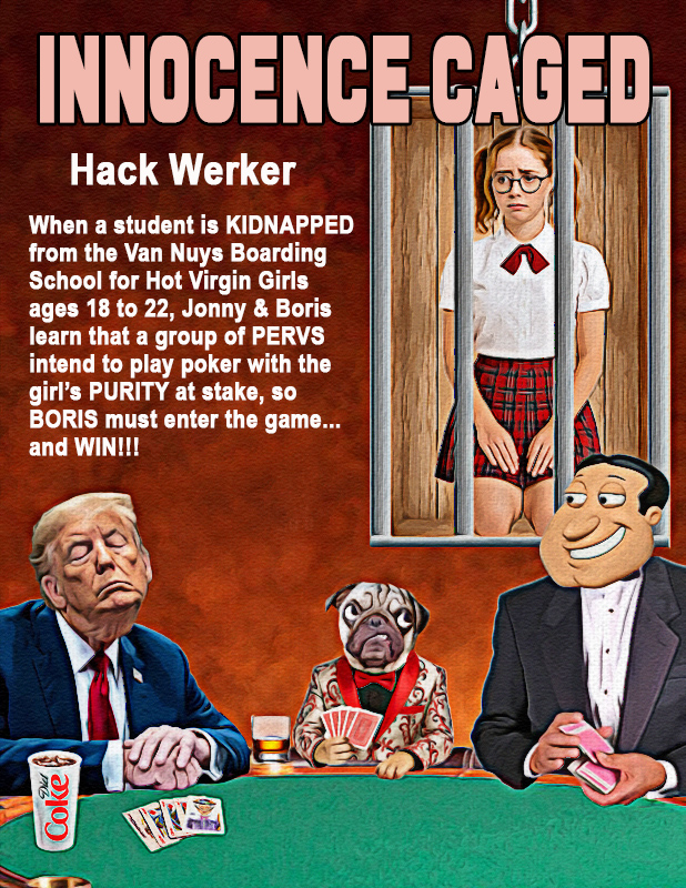 This was one of Hack’s most controversial titles. The city’s mob kingpin has his goons kidnap a senior from the Van Nuys Boarding School for Hot Virgin Girls, ages 18 to 22 and play cards to see which of the town’s sexual deviants will take her virginity. Boris gets in the game to save her and just as he is on the verge of winning, he loses the last hand with four aces to a local perv’s royal flush (Hack doesn’t really understand poker). But just as the perv is about to deflower her, Boris takes out a semi-automatic and blows everyone at the table away. It’s a feel-good escapist piece of fluff.