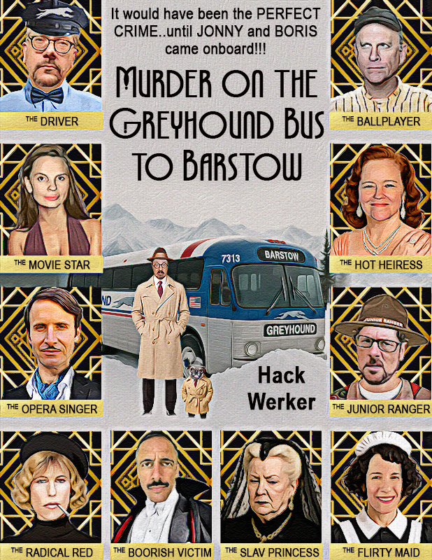 Jonny didn’t answer right away. He just struck a match on the toe of his shoe and lit a Lucky like he was auditioning for a cigarette ad. The smoke curled around his head like a noose waiting for the right neck. He looked out the window as the bus lurched forward, Van Nuys shrinking behind them like a bad alibi. But as Boris beheld the uncomfortable expression on the faces of the other passengers at their arrival, the little pug knew that the presence of a famous detective team wasn’t welcome. All of the travelers seemed out of place for the journey ahead: a sexy Hollywood movie star who brought six months’ worth of luggage for a three-hour bus tour, a washed-up pitcher in the majors who was trying to squeeze out one last season in the Barstow Winter Rookie League, a gorgeous heiress who every newspaper in the country was looking for since she disappeared to elope with the fortune hunter her billionaire father hated. Everyone on the bus had two things in common; a backstory which made their presence implausible and a noticeable shudder when they saw Jonny and Boris take their seats.